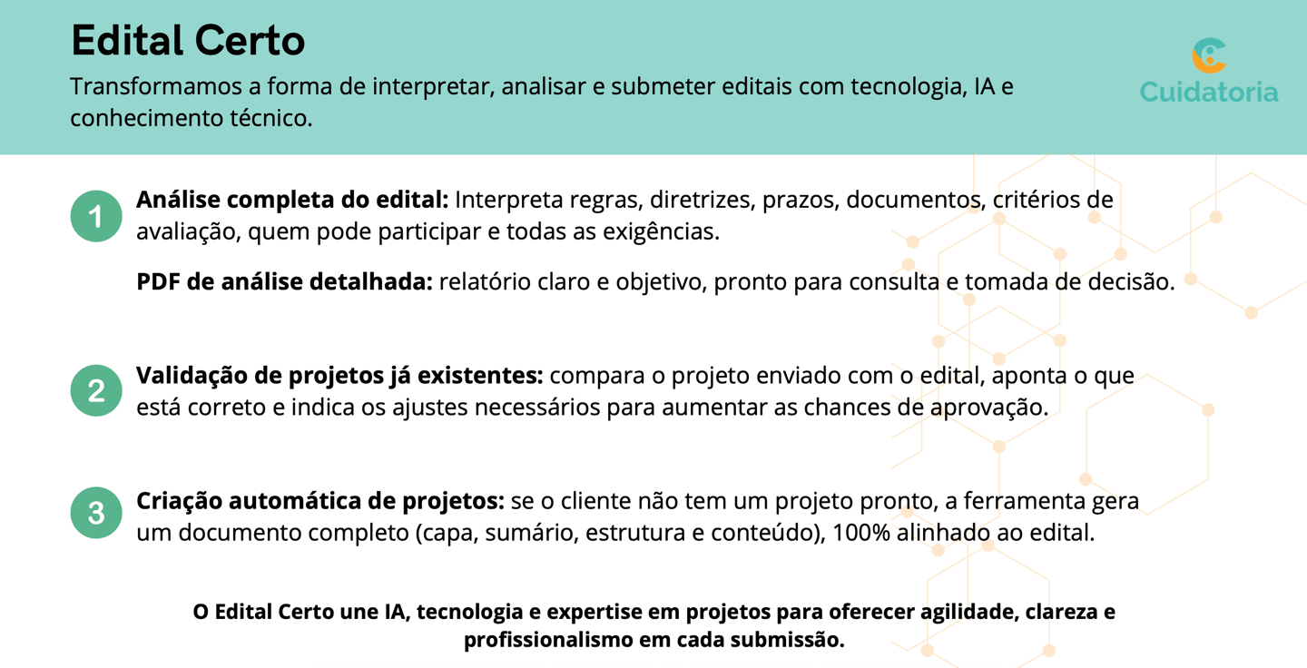 Para OSCs: análise de edital em minutos, projeto pronto, CRM de captação e credibilidade comprovada para abrir portas.