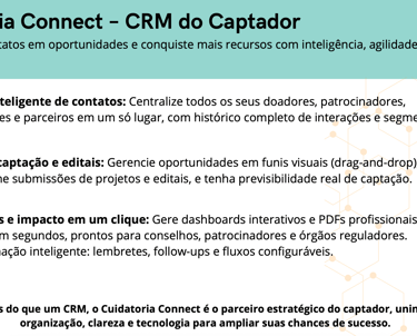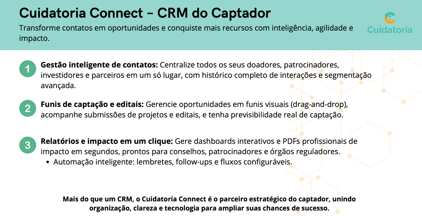 A Cuidatoria 360° é a plataforma que conecta inteligência, execução e transparência para acelerar recursos com segurança.