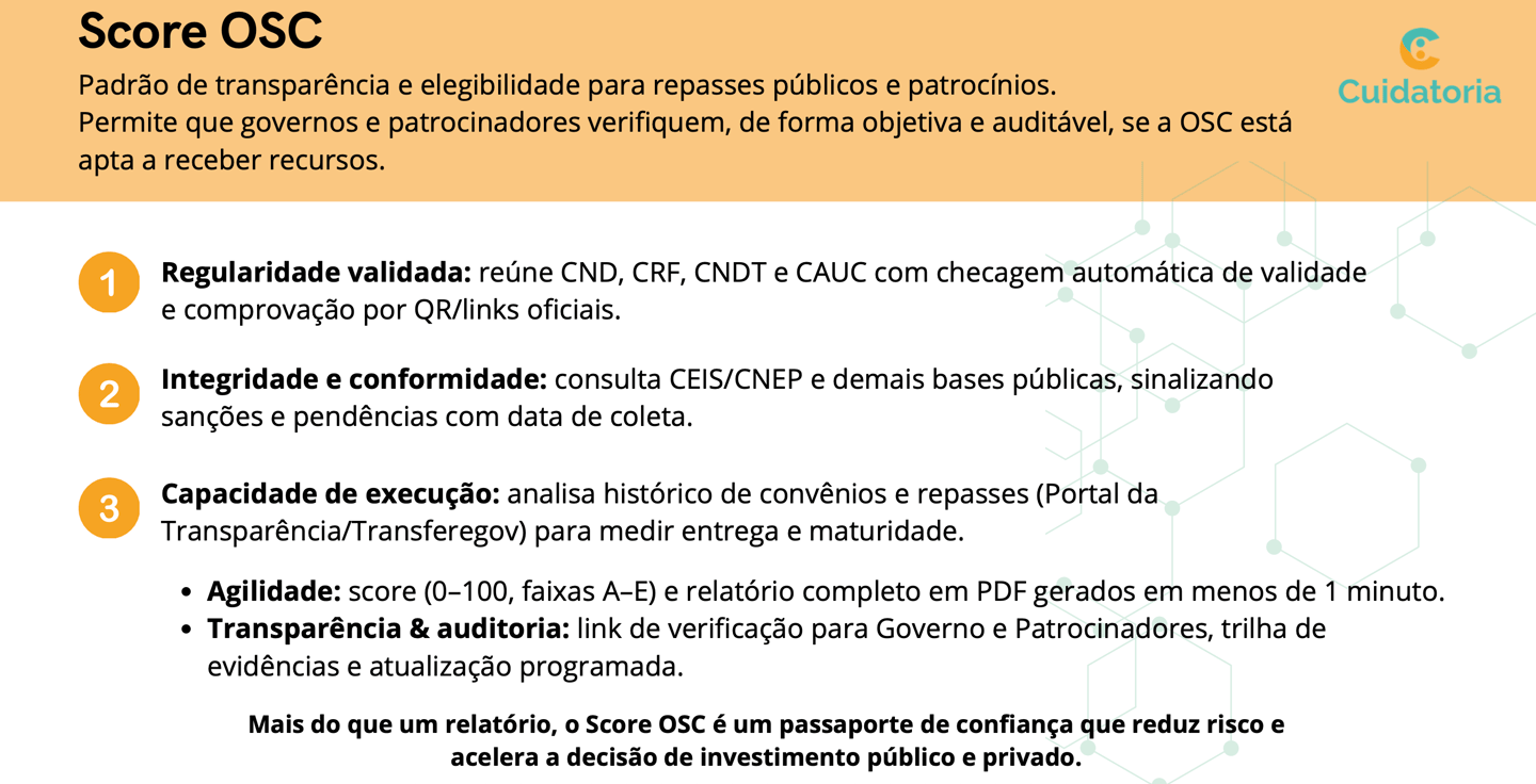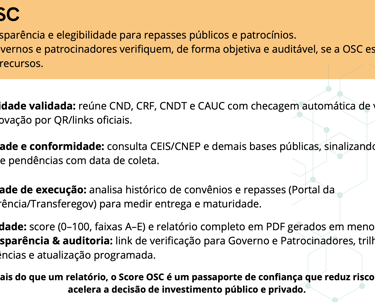 Para Empresas: due diligence ágil com Score OSC (0–100) auditável, compliance para Leis de Incentivo e relatórios ESG em um clique.